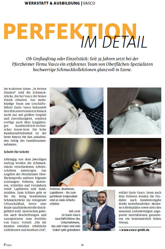 Es ist schon ein kleine Erfolgsgeschichte, die die Vasco GmbH vorzuweisen hat: Seit nunmehr 35 Jahren steht das Unternehmen für Knowhow, Zuverlässigkeit und Qualität wenn es darum geht, Schmuck und Accessoires zum Glänzen zu bringen.
